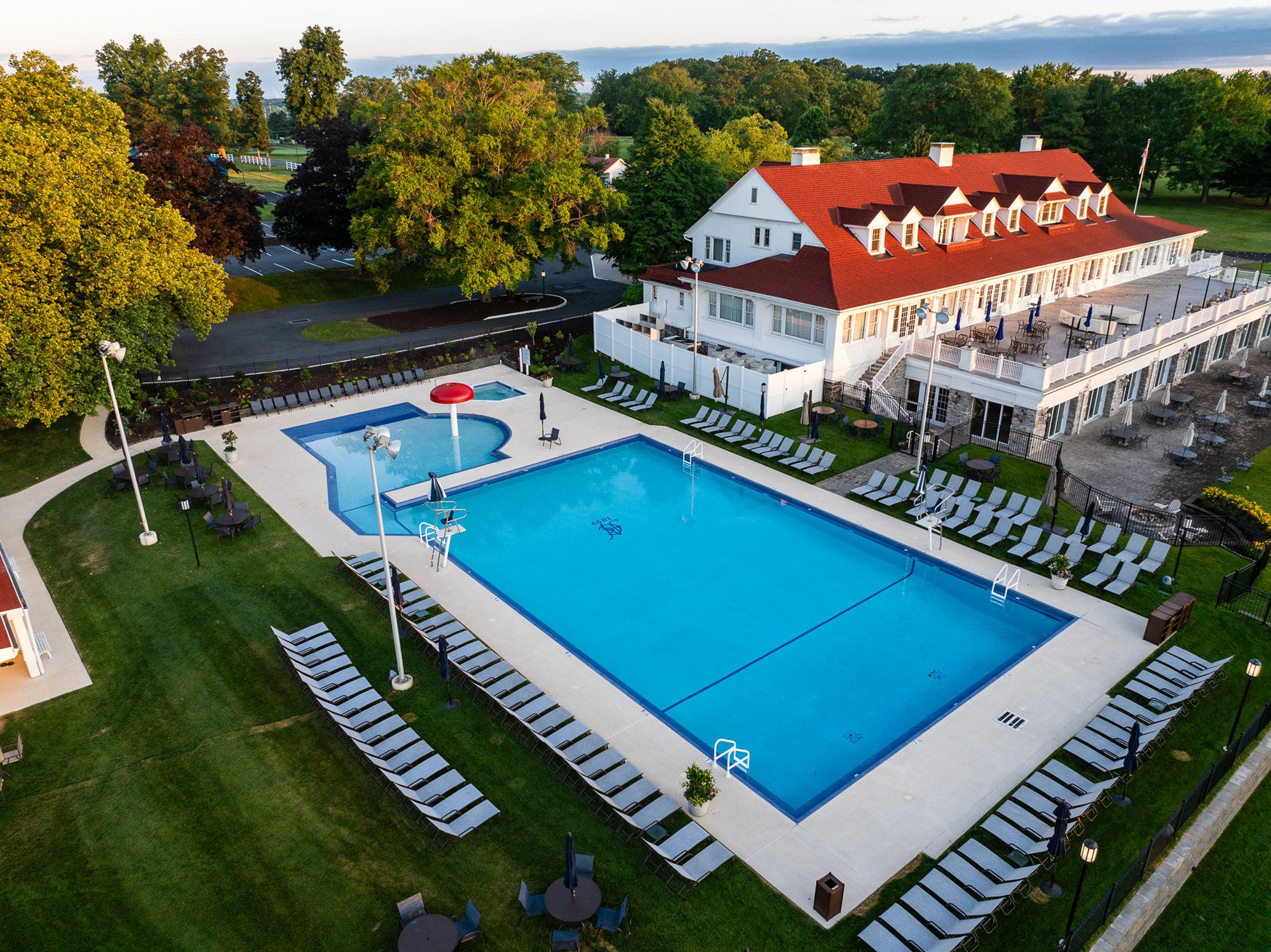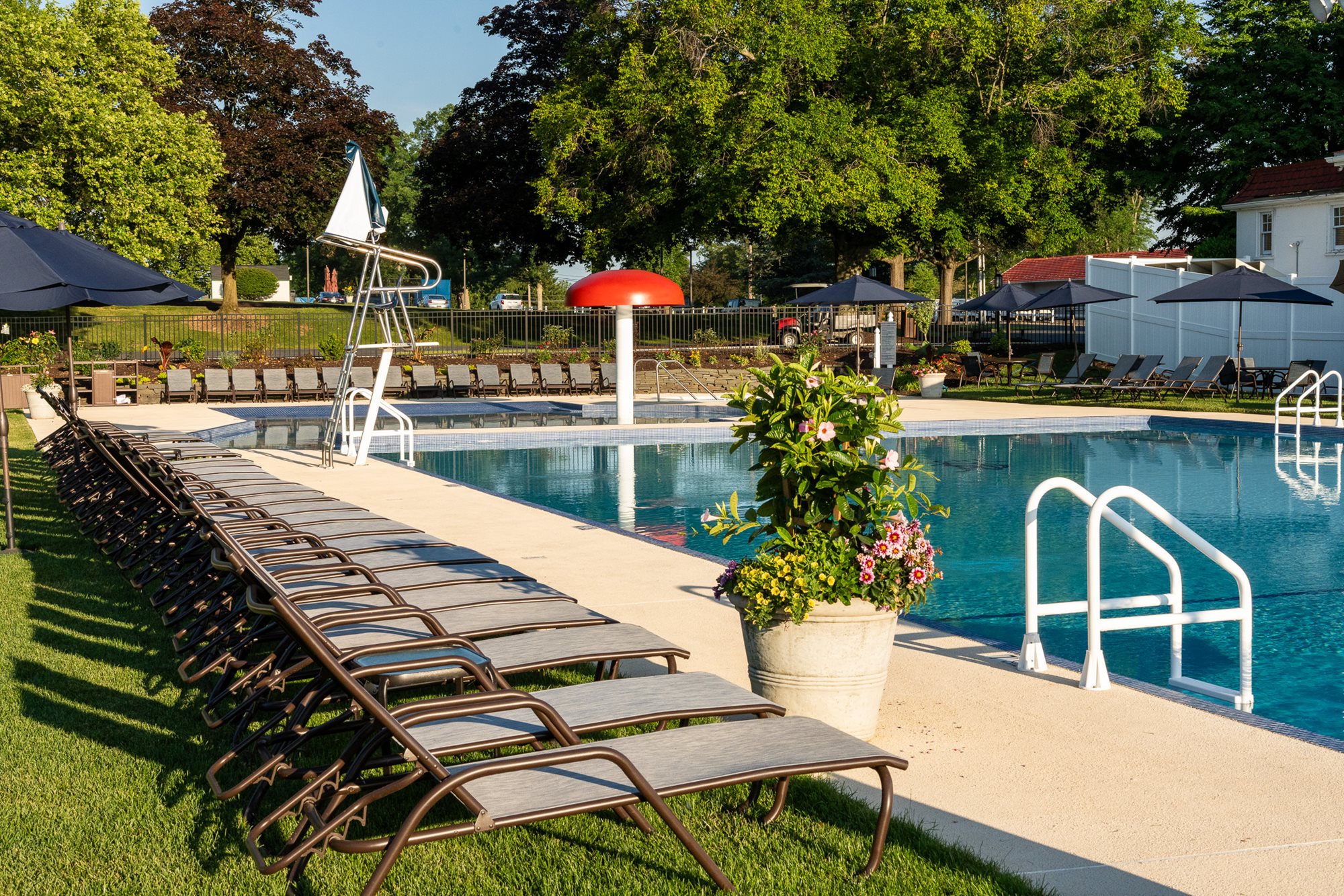 The Northampton Country Club swimming complex has a competition sized pool that ranges from three (3) to seven (7) feet deep, is heated and is attended by our in-house lifeguards.  In addition, there is a zero-entry level, mushroom waterfall for the younger members, and a heated spa for the older members.  Northampton Country Club does offer a towel service and locker rooms to change in inside the pool complex.  We also have a number of umbrellas and chaise lounges for your comfort.